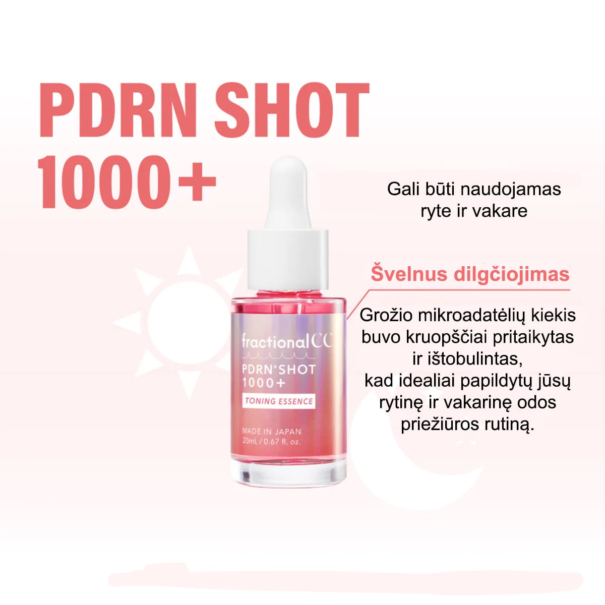 Drekinanti Frakcinė veido esencija „PDRN Shot 1000+“ yra inovatyvus odos priežiūros produktas pagamintas naudojant Beauty Micro Needle Technology (Tai tirpios mikroskopinės adatėlės, leidžiančios ingredientams prasiskverbti gilyn be adatų). Esencijos sudėtyje yra peptidų ir gausu kitų veikliųjų medžiagų, skirtų intensyviam drėkinimui, elastingumo atkūrimui ir odos regeneracijai.